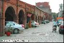 老街房舍全部以紅磚為建材,老街的建築式樣較為特殊,牌樓立面屬於羅馬巴洛克建築,架構採閩南式,拱形的門廊戶戶相對,街屋整齊一致都設有騎樓,一樓柱節單拱走廊,二樓窗戶和女兒牆間有水泥楣點綴,商號名稱鐫刻其上,簡潔大方。走完整條街,就宛若歷經一部模糊的歷史。