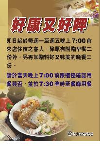 即日起平日週一至週五晚上七點前進房住宿者 贈送晚餐早餐各兩份