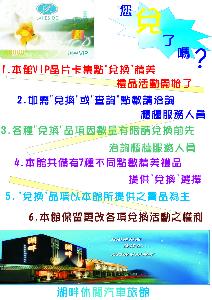 感謝大家踴躍支持 『湖畔』VIP晶片卡的誕生! 尚未申請之來賓,請速申請,好康多多多喔! VIP晶片卡集點“兌換”精美禮品活動開跑了! 洽詢專線:(07)7352988