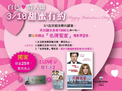 即日起至伊甸風情精品旅店消費的顧客, 凡加購 1張 VIP房休息券, 即贈 2張 3/10『名牌冤家』威秀影城電影票(限量25套)。 詳情請上官網http://www.eden-motel.com.tw或電洽07-9740888, 伊甸風情與您甜蜜有約!