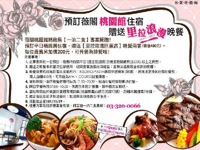 薇閣桃園館精緻房【一泊二食】專案開跑! 即日起,電話預訂平日精緻房住宿,即贈送【里拉玫瑰巨蛋店】價值共480元晚餐兩客。貴賓另加價400元,可升級為排餐兩客哦! 活動截止至 101/11/29 本優惠活動需入住前完成費用匯款 優惠方案每日供應數量有限,請直撥一泊二食專線;03-3200066