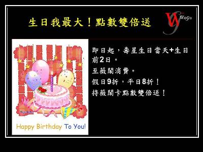 即日起,壽星生日當天+生日前2日。 至薇閣消費。 假日9折,平日8折! 持薇閣卡點數雙倍送! 請於進房時主動出示證明文件