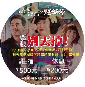 活動期間持電影"總舖師"票根 到天韻旅館旗下系列旅館消費 可享史上最強獨家優惠喲!! ***活動詳情請洽各館櫃檯人員***