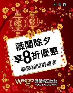 吃完團圓飯後,發現家裡住不下這麼多親朋好友嗎?2014年大直薇閣農曆春節除夕8折優惠住房專案,讓我們提供專業的服務且優惠的價格,與您一同歡慶快樂新年!請洽訂房專線(02)8502-7000轉3。