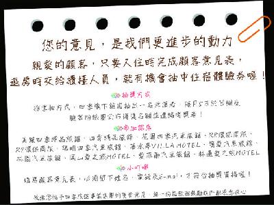 親愛的顧客,只要入住時完成顧客意見表,