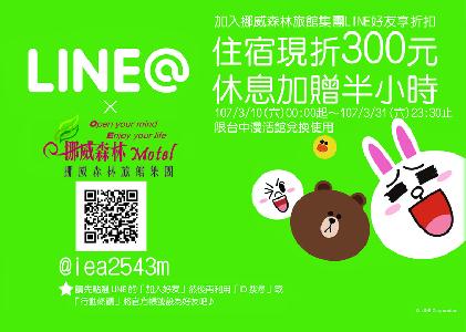 活動時間:107/03/10(六)00:00起至107/03/31(六)23:30止 活動館別:限台中漫活館兌換使用 活動內容: 1.客人check in時於櫃檯出示手機優惠券畫面。 2.由櫃檯人員點選”使用優惠券”即可享有休息加贈半小時, 住宿現折300元之折扣。 3.不限房型/不分平假日皆可使用。