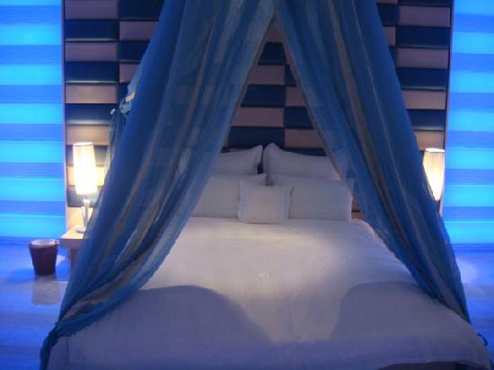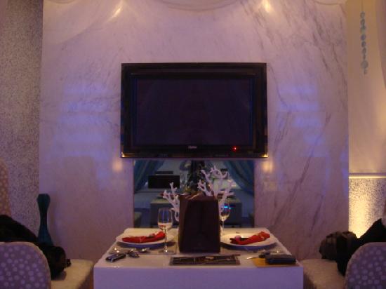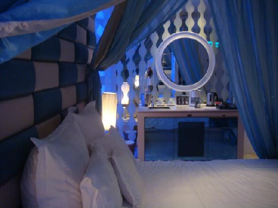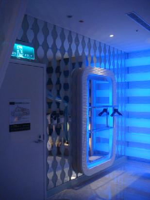 浪漫愛情海的房間設計真的很浪漫!柔和的藍系色調佈置和採光~雖說是冷色系卻讓人覺得溫馨又夢幻~房間的設備堪稱得上六星級~一般飯店的設備就不用說了~雙人按摩幻彩浴池~蒸氣室~還有各種貼心備品等等~應有盡有!環境也很乾淨整齊~服務人員態度親切~服務效率高~如果真要雞蛋裡挑骨頭的話~唯有KTV的選歌遙控器不太靈光~有點難按~還有逃生指示燈實在太"顯目"了點~有點妨礙睡眠了喔~除了這兩個小缺點外~其他都很令人滿意~和閃光在這裡度過了美好的一夜~^^另外要補充一點~之前就上網看過許多住宿心得~發現薇閣真的是有用心在經營~許多大家提過的小缺失幾乎都沒有發生在我們身上~讓我們住得很舒適!希望新竹薇閣繼續加油~讓每位來消費的客人都能享受到最高級最優質的服務品質!
