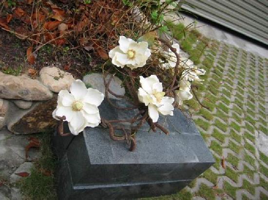 台中沐蘭尊爵套房302R 門口有雞蛋花, 小小的車庫,心想上樓一定嚇一跳 上了樓後果然嚇一跳, 兩個鳥籠 大到不行的花缸岩浴缸 120吋投影電視 可以打滾的蚊帳床 當然沒有人說雞蛋花不好