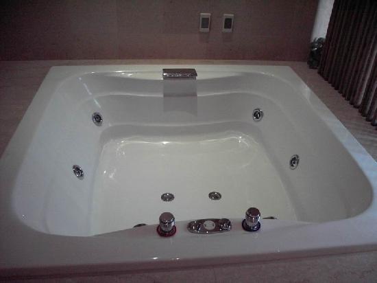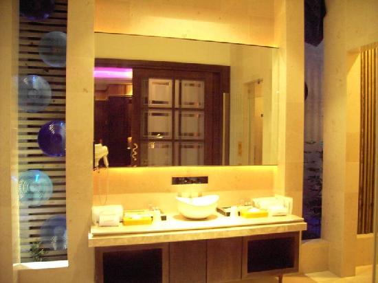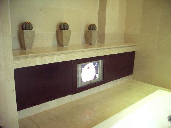 浴室的部份..按摩浴缸和電視也都有.該有的浴室備品也都齊全,最重要的..浴缸有七彩的功能,燈光的變化..讓人感覺很優.浴室裡還有造景..呵呵..唯獨..馬桶的部份..如果有簾子或是小門遮遮會更優.