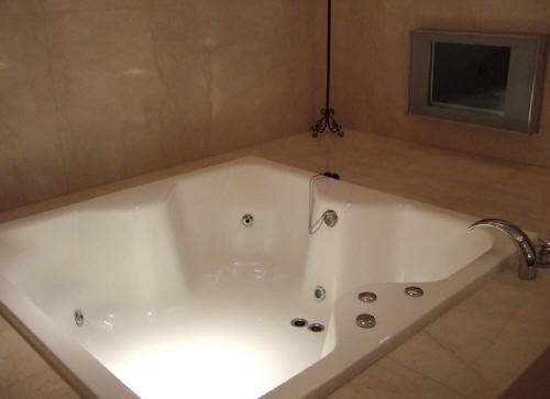 浴缸是我喜歡的雙人按摩浴缸旁邊有小電視,床的對面是一台40吋左右的液晶電視,不知是太多人剛好在用水還是怎樣的,洗澡的水量很小...這是唯一美中不足的地方
