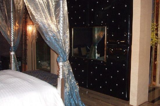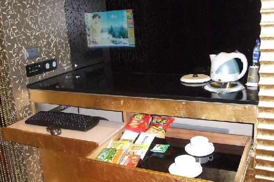 床與珠廉的中間是點心櫃 點心櫃的牆面隱藏了一個電腦螢幕